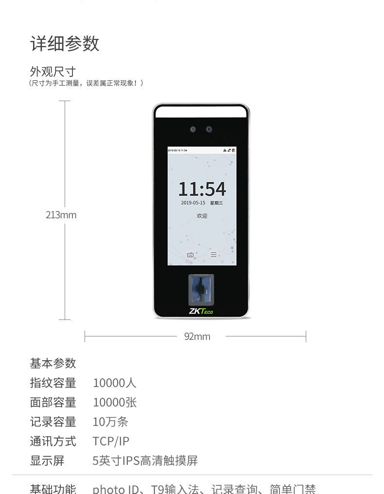區別于以往的人臉靜態識別,具有快速讀取、動態識別的功能。BioFace具有人臉錄入和人臉識別功能,指紋、人臉等多種驗證方式,簽到多種選擇,輕松考勤;谷歌輸入法,輕松編寫。標配Wiegand in/out,具有門磁、報警等多種功能,守護您工作安全。